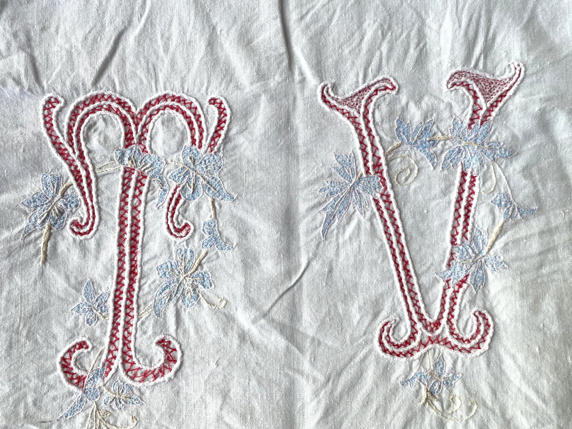 TV hand stitched in variety of stitch techniques with blue, red, white botanical leaf motif on handwoven linen top sheet. Antique - over 100 years old. Condition: very good with no stains or tears. Dimensions: 100" length x 79" width.