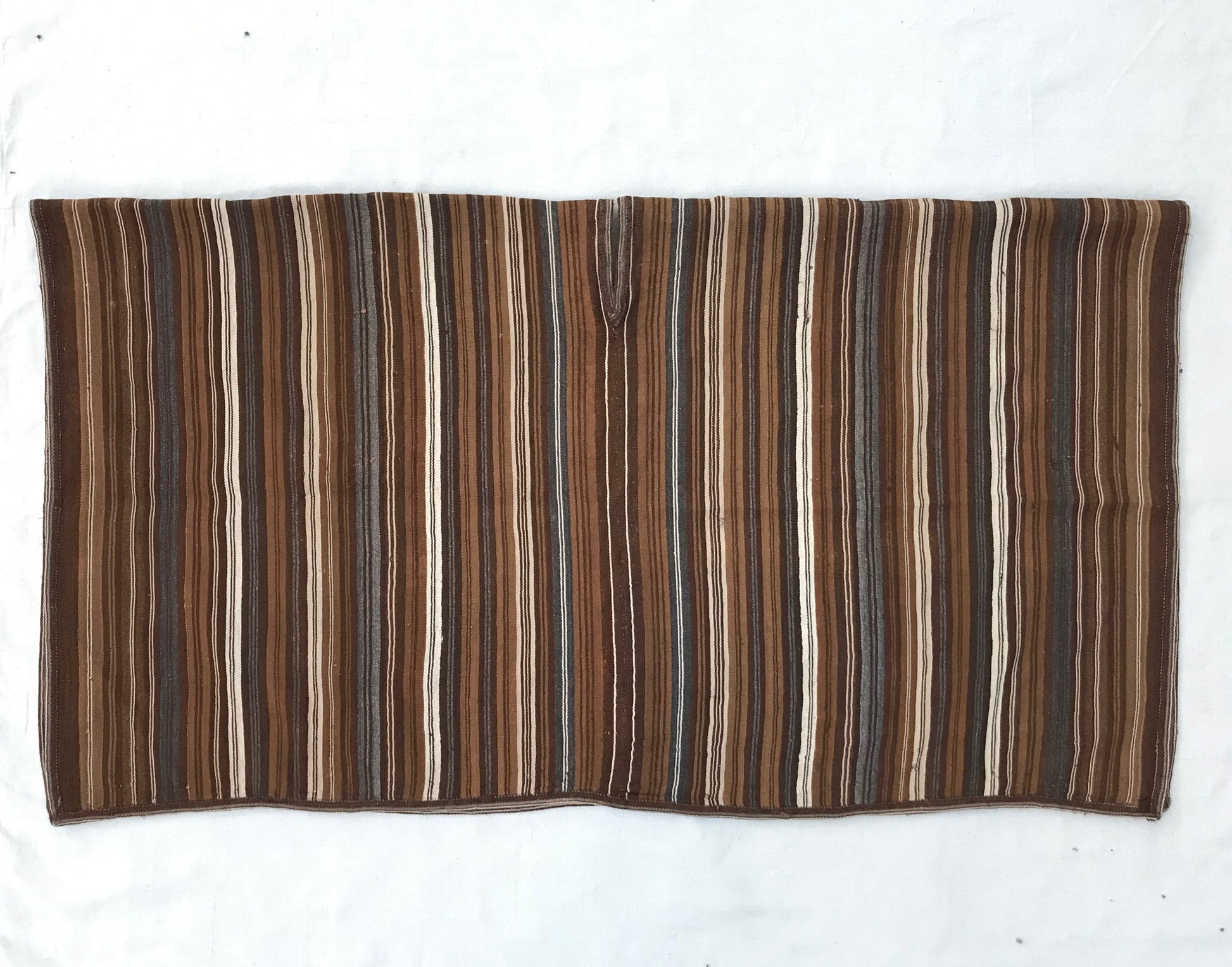 Handwoven using naturally striated shades of wool and occasional stripes of dyed color.
